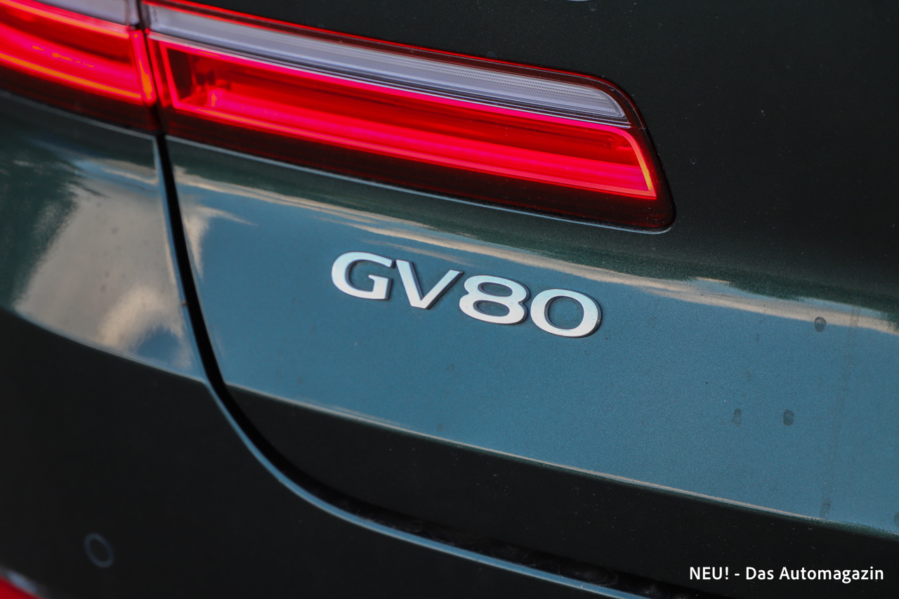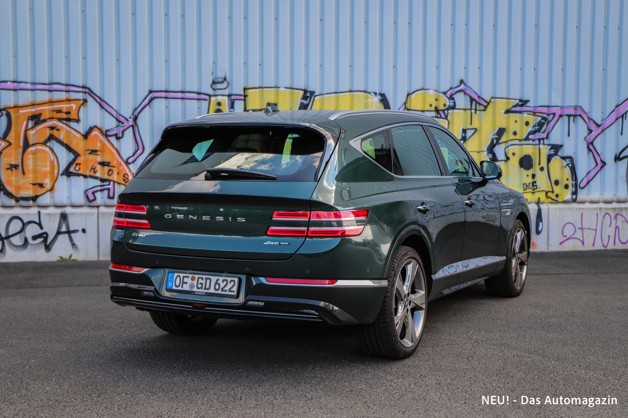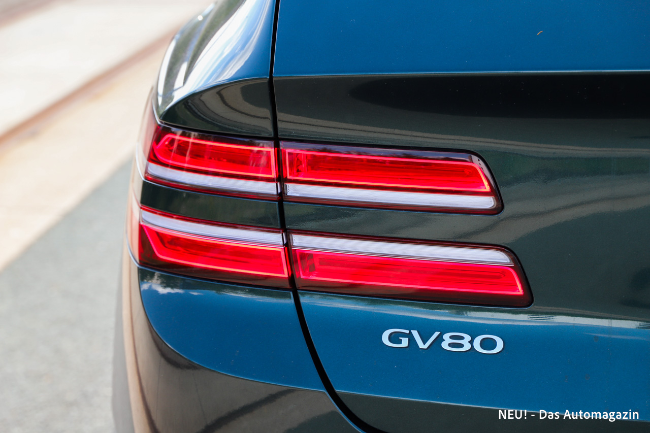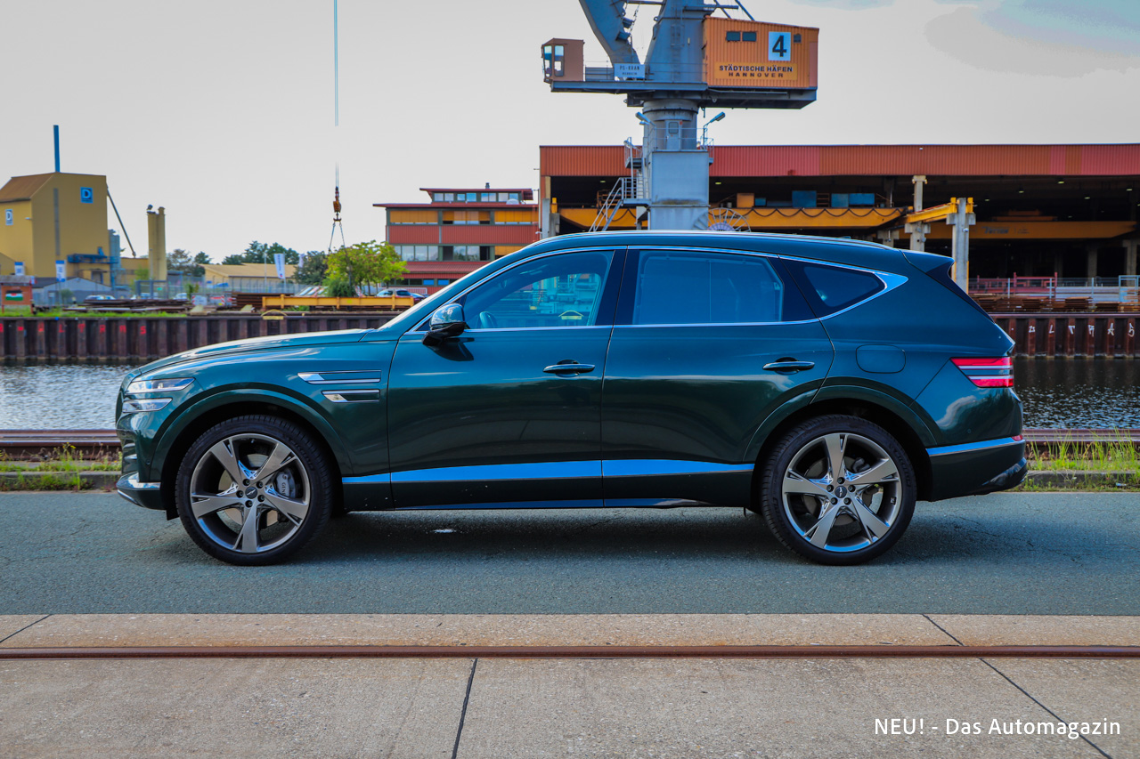 Die Seitenansicht zeigt ein langgezogenes Profil, das mit 22-Zoll-Rädern zwar wuchtig wirkt, aber dennoch nicht überzeichnet. Chromleisten, klare Falten und die charakteristischen horizontalen LED-Streifen auf den vorderen Kotflügeln setzen Designpunkte, die man im Straßenbild sofort wiedererkennt. Der GV80 gehört zu den SUVs, die Größe nicht verstecken, sondern würdevoll ausspielen.