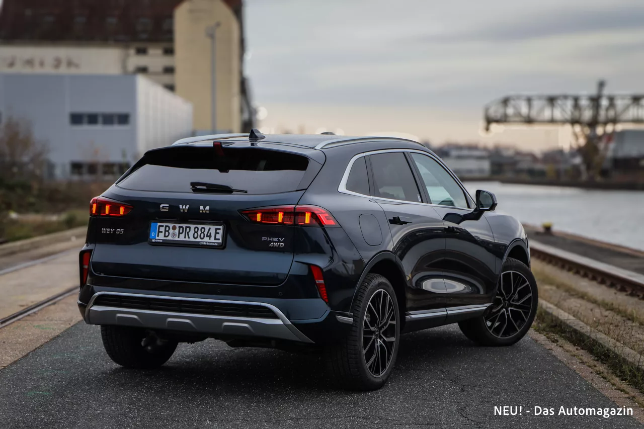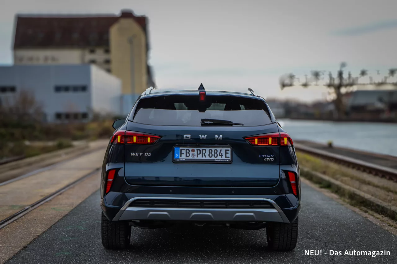 Am Heck zeigt der Wey 05 ein Bauteil, das im Alltag sofort ins Auge fällt: die vertikal ausgerichteten Rückleuchten mit 3D-Effekt. Sie wirken modern, ohne modisch zu sein, und bilden einen schönen Kontrast zu den breiten Flächen des Hecks. Ein angedeuteter Diffusor und ein sehr sauber integriertes Endrohrdesign unterstützen den eleganten Auftritt, ohne ihn ins Sportliche zu überzeichnen.