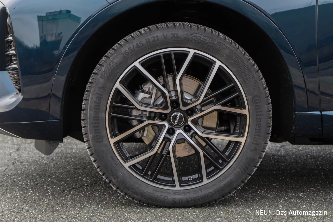 Besonders gelungen ist die Seitenansicht. Das Greenhouse zieht sich nach hinten spürbar zusammen und verleiht dem SUV eine leichte Coupé-Anmutung. Gleichzeitig wirken die 21-Zoll-Räder erstaunlich harmonisch im Radhaus und lassen das Fahrzeug optisch tiefer stehen. Die Gürtellinie steigt deutlich an und erzeugt eine optische Dynamik, die dem sonst sachlichen Design einen sportlichen Unterton verleiht. Hinzu kommen elektrisch einfahrbare Türgriffe, die der kleine Bruder (Test des GWM Wey 03) nicht vorweisen kann.