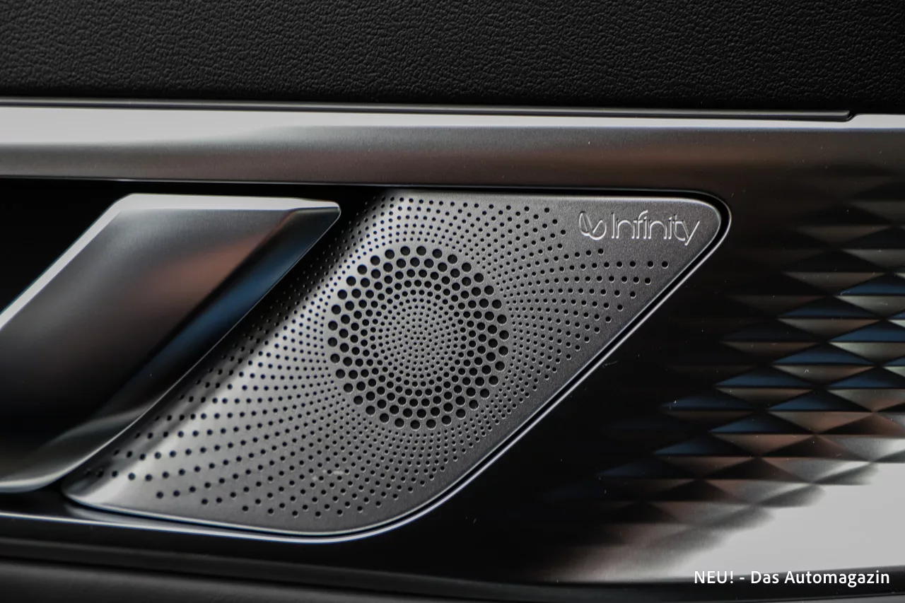 Unser Testwagen trat als Premium-Version an, die bereits einen sehr umfangreichen Serienumfang bietet. Für 59.900 Euro gehören unter anderem das Head-up-Display, zahlreiche Assistenzsysteme, LED-Licht, kabelloses Laden, 360-Grad-Kamera, Infinity-Soundsystem und hochwertige Sitzbezüge zur Grundausstattung. Auch Funktionen wie Sitz- und Lenkradheizung, Ambientebeleuchtung und elektrisch verstellbare Vordersitze sind serienmäßig enthalten.