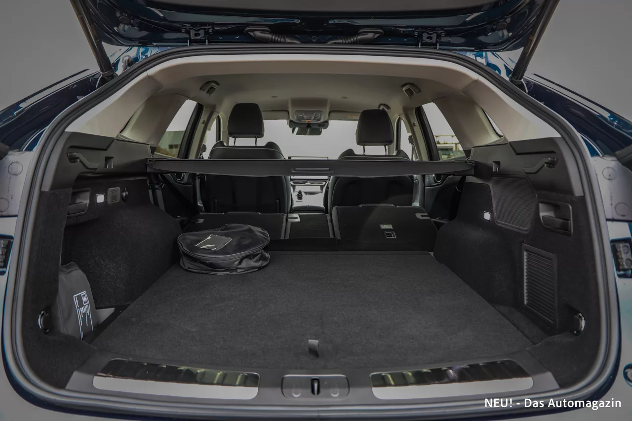 Der Kofferraum bietet 500 Liter Volumen, was angesichts der Fahrzeuggröße solide, aber nicht überragend ist. Umgeklappt werden rund 1.200 Liter erreicht, allerdings würde eine verschiebbare Rückbank den praktischen Nutzen deutlich erhöhen. Positiv fällt die fehlende Ladekante auf, die das Be- und Entladen erleichtert. Der Innenraum hinterlässt insgesamt den Eindruck eines Fahrzeugs, das Komfort und Design klar priorisiert – und das durchaus überzeugend.